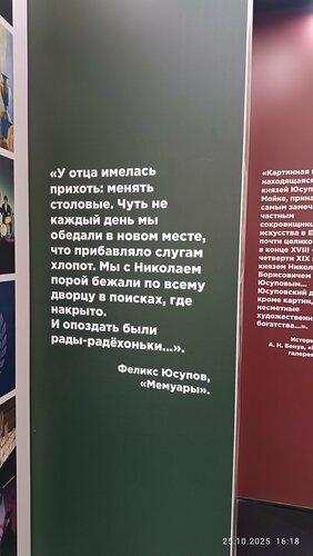Место, где обязательно стоит побывать в любом из вариантов посещения - полный маршрут, частичные варианты или различные театральные, музыкальные представления. Мы ходили по маршруту, включающему 28 комнат. Отличная организация - билет можно оформить на сайте или в кассах. В здании касс можно взять аудиогид . Тут же хочется отметить невероятных сотрудников. Приветливые, готовые ответить на вопросы, помочь сориентироваться. Далеко не всегда и не во всех музеях можно пообщаться с такими сотрудниками. Здесь реально атмосфера дворца начинается с момента покупки билета. Очень хороший аудиогид, все подробно, но не утомительно. Интерьеры Дворца великолепные. Хочется ходить и рассматривать, всматриваться в каждую мелочь, захотелось узнать более подробно историю Юсуповых. Обязательно приду ещё.