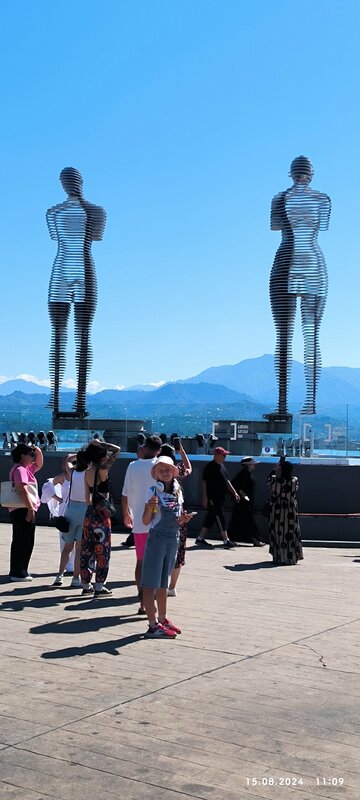 А вы знали, что высота статуй всего восемь метров? Я раньше думала, что они гигантские! Вот фотографы дают..))) Но все равно, очень интересно на них смотреть, как они кружат. Главное, чтобы народу не много было на площади. А ещё, можно поймать момент, когда Али и Нино соприкасаются губами, и улыбнуться )