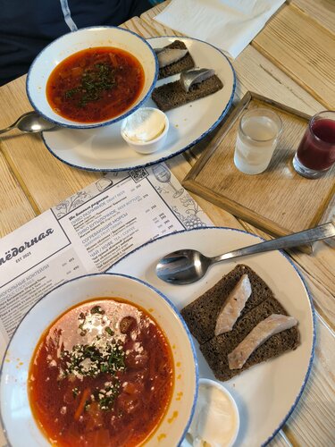 Не поели) Зашли с мороза в данное заведение, посадили за стол ( спасибо за это), сразу предупредили каких позиций нет( речь шла о определённых блюдах). Мы приняли решение, что закажем борщ ( казалось бы, не супер изысканное блюдо). При заказе с ухмылкой официант ( не посмотрела жаль имени) ответила что борща нет. Ну класс, а сказать чтобы мы не теряли времени? О люля она знает что их не было, о борще не в курсе, хотя когда она нас посадила за столик, при её озвучивании каких блюд нет в наличии, мы несколько раз произнесли главное чтобы борщ был))) Ладно, что его нет, научите что ли инфу преподносить клиентам кафе( ресторана) подобающе.