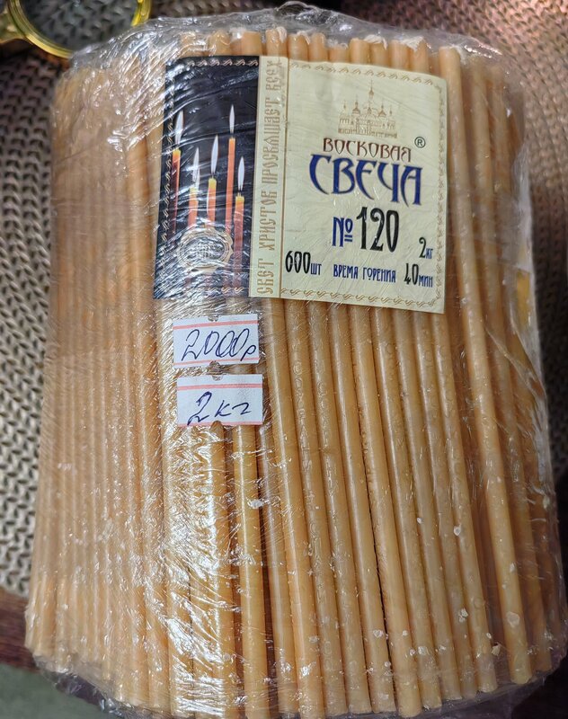 При покупке свечей спросили несколько раз с добавлением парафина или полностью изготовлены из воска. Девушка (работник церковной продукции) сказала что это свечи из чистого воска. Купили. Привезли домой, достали и разочаровались т.к. свечи эти парафиновые с запахом воска. Покупаем всегда в Софрино 100% воск за 1 750,00 , здесь купили за 2 000,00. Дело не в цене. Фотографию купленных свечей прикладываю. Не нужно вводить в заблуждение. Храни всех Господь.
