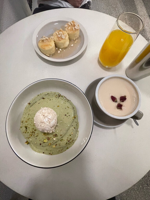 Вкусно! Красиво и уютно Панкейки с матчей очень понравились, сытные😍 даже не доела до конца Сырники тоже понравились