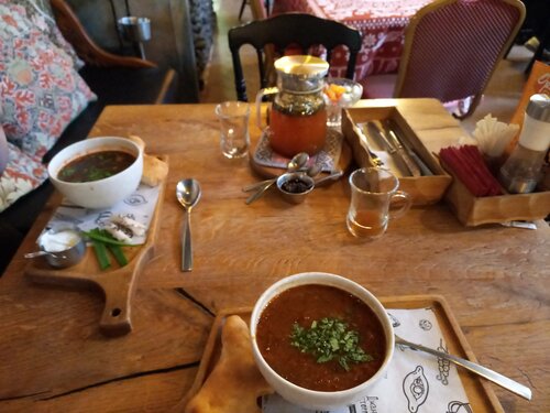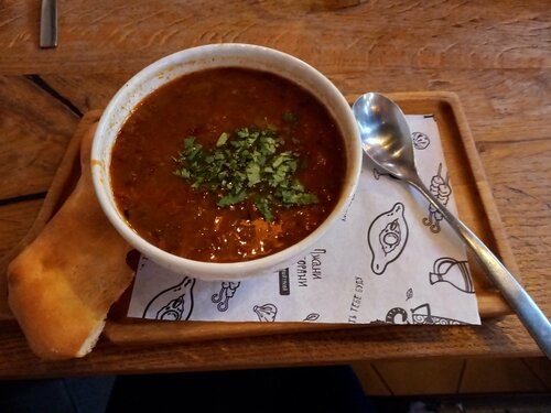 Были в этом ресторане первый раз с мужем, путешествовали по Нижнему. Выбрал муж по отзывам и не прогадал! Очень понравилось! Рекомендую всем! Позвонили в ресторан, забронировали столик, нам предложили веранду с пледом и обогревателями (хотя там было тепло и много гостей, два застолья даже на закрытой веранде). Мы приехали, попросились на 1 этаж, нам сразу же нашли столик. Официант Матвей услышал пожелания мужа, быстро нас обслуживал, не навязчиво, понравилось. Когда он спросил всё ли нам понравилось, муж сказал, что все понравилось, зелень и овощи были очень вкусными, но огурцы не зашли. Официант быстро предложил в качестве комплимента тортик нам с собой. Спасибо большое! Очень приятно. Кухня просто реально вкусная, атмосфера уютная, обслуживание комфортное и внимательное. Спасибо большое шефу, су-шефу, администратору, официанту и всей команде ресторана! Реально молодцы, ребят! Видно, что очень стараются и не зря. Заказывали супы, чай, хинкали, овощи и зелень, подали перчатки, мясо свежее, всё очень вкусное! А еще мы попали с мужем в момент, когда поздравляли в зале с днем рождения за соседним столиком! Это просто шикарно! Не просто песни с бубнами всем коллективом, а рог с вином (спросили у именника перед можно ли ему вроде), очень душевное и красивое поздравление, да такое, что аж весь зал 1 этажа хлопал! Реально от души! Успехов и процветания такому коллективу и ресторану! Порекомендую всем знакомым. В отличие от другого заведения, где мы были за день до этого, это просто классное! Спасибо!